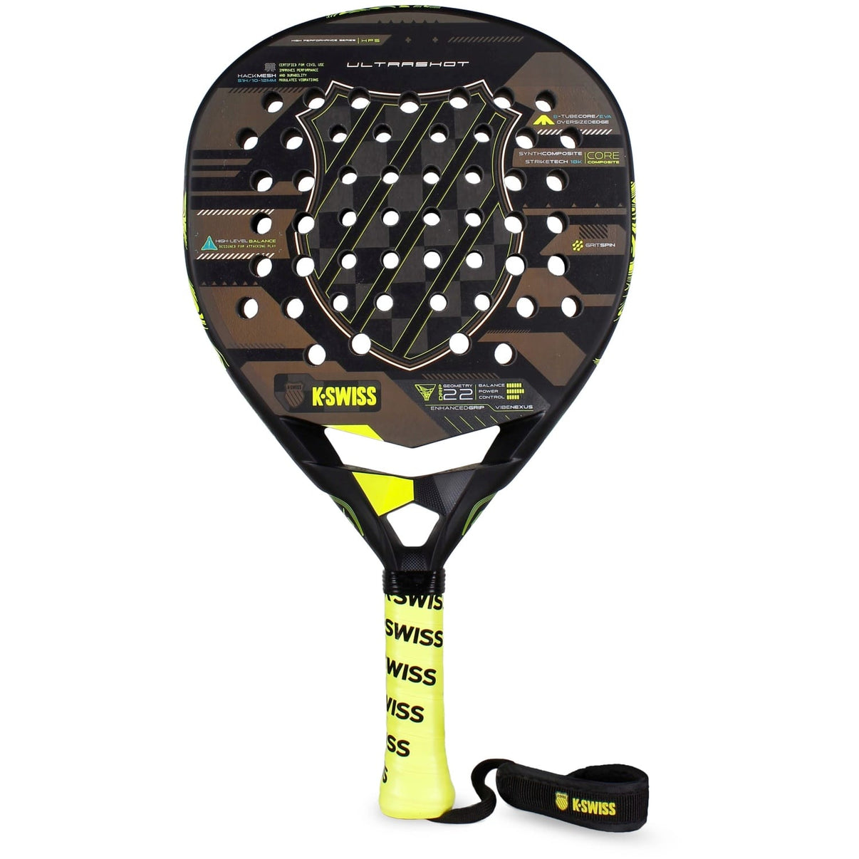 La K-Swiss Ultrashot (18K) es una pala diseñada para jugadores experimentados y de alta competición, que buscan precisión y potencia en cada golpe. Su composición avanzada combina materiales de máxima rigidez con un núcleo reactivo, ofreciendo un rendimiento superior en situaciones de juego exigentes.